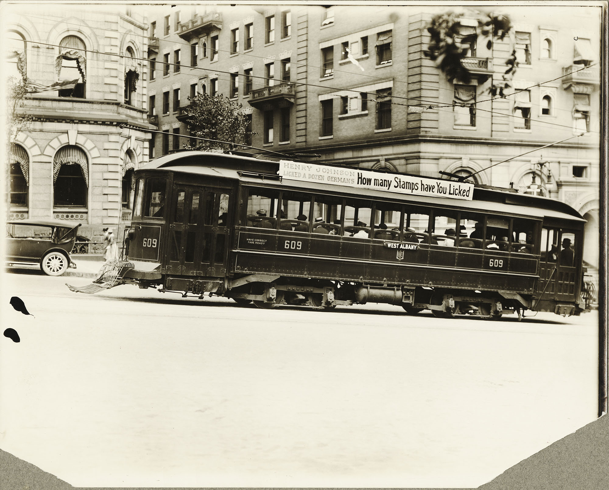 Trolley sign reads: “Henry Johnson/ Licked A Dozen Germans/ How many Stamps have You Licked”
