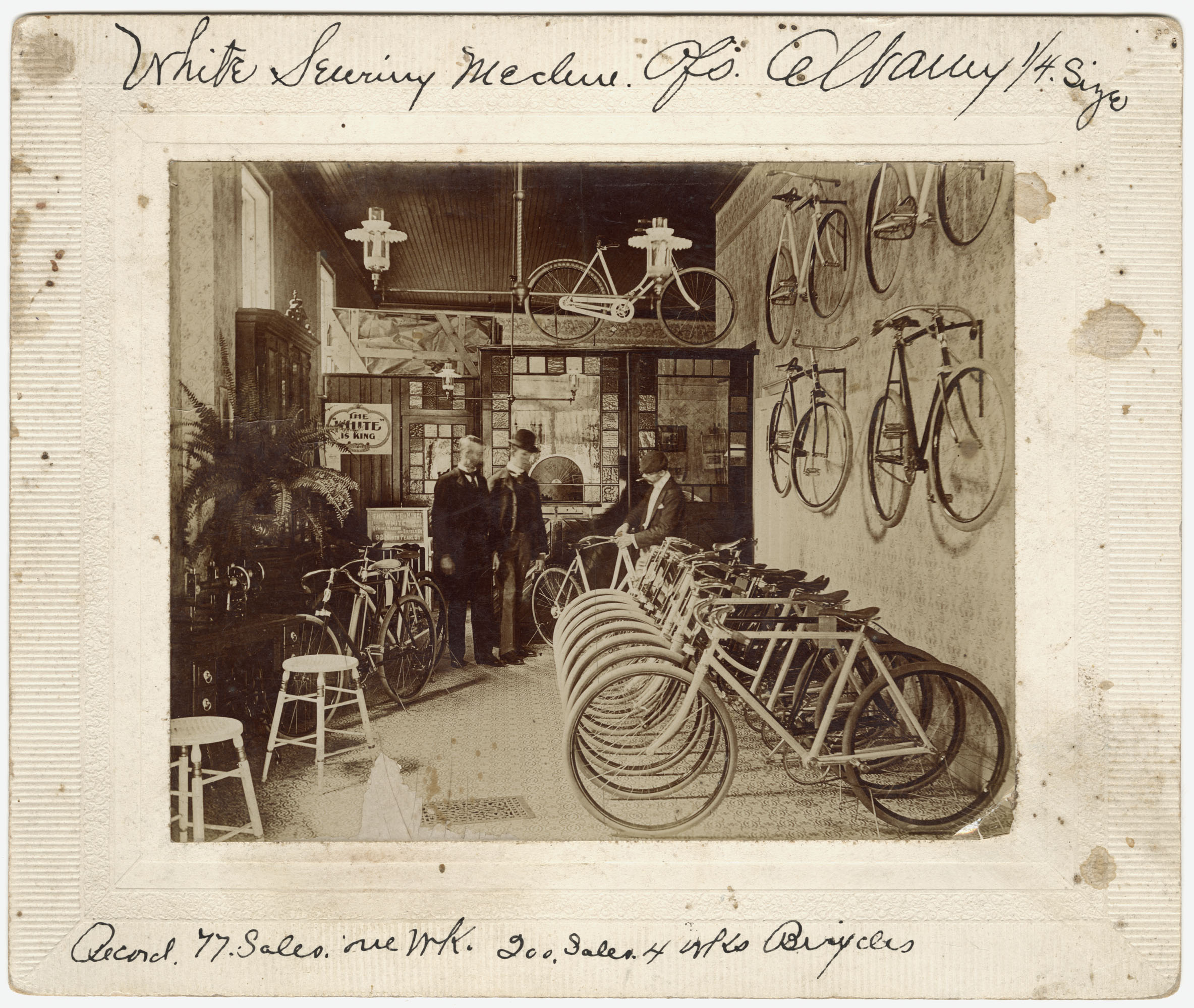 In ink on top: “White Sewing Machine of Albany 1/4” size, Bicycle Shop”