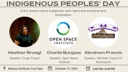 This Indigenous Peoples' Day, the Albany Institute of History & Art is hosting a live, no-cost Q& A session about ancestral land, Indigenous land rights, and land reclamation. Participants include Heather Bruegl, Cultural Affairs Director, Stockbridge-Munsee Community; Charlie Burgess RPA, Stewardship Manager at Open Space Institute; and Abraham Francis, Environmental Services Manager, Mohawk Council of Akwesasne.