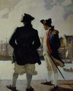 IMAGE: On the Sea Wall with John Paul Jones | For a long moment Paul Jones gazed out over the crowded shipping, down the long narrow harbor, out to the open water. He whistled dolefully between his teeth. N. C. Wyeth(1882–1945), 1928, oil on canvas, Bank of America Collection