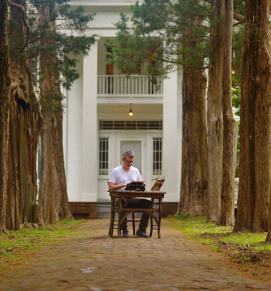 Image: Tim Youd retyping William Faulkner's The Sound and the Fury; 326 pages typed on an Underwood Universal typewriter; Faulkner's home "Rowan Oak," Oxford, MS, June 2014. Photo credit: Robert Jordan, University of Mississippi.
