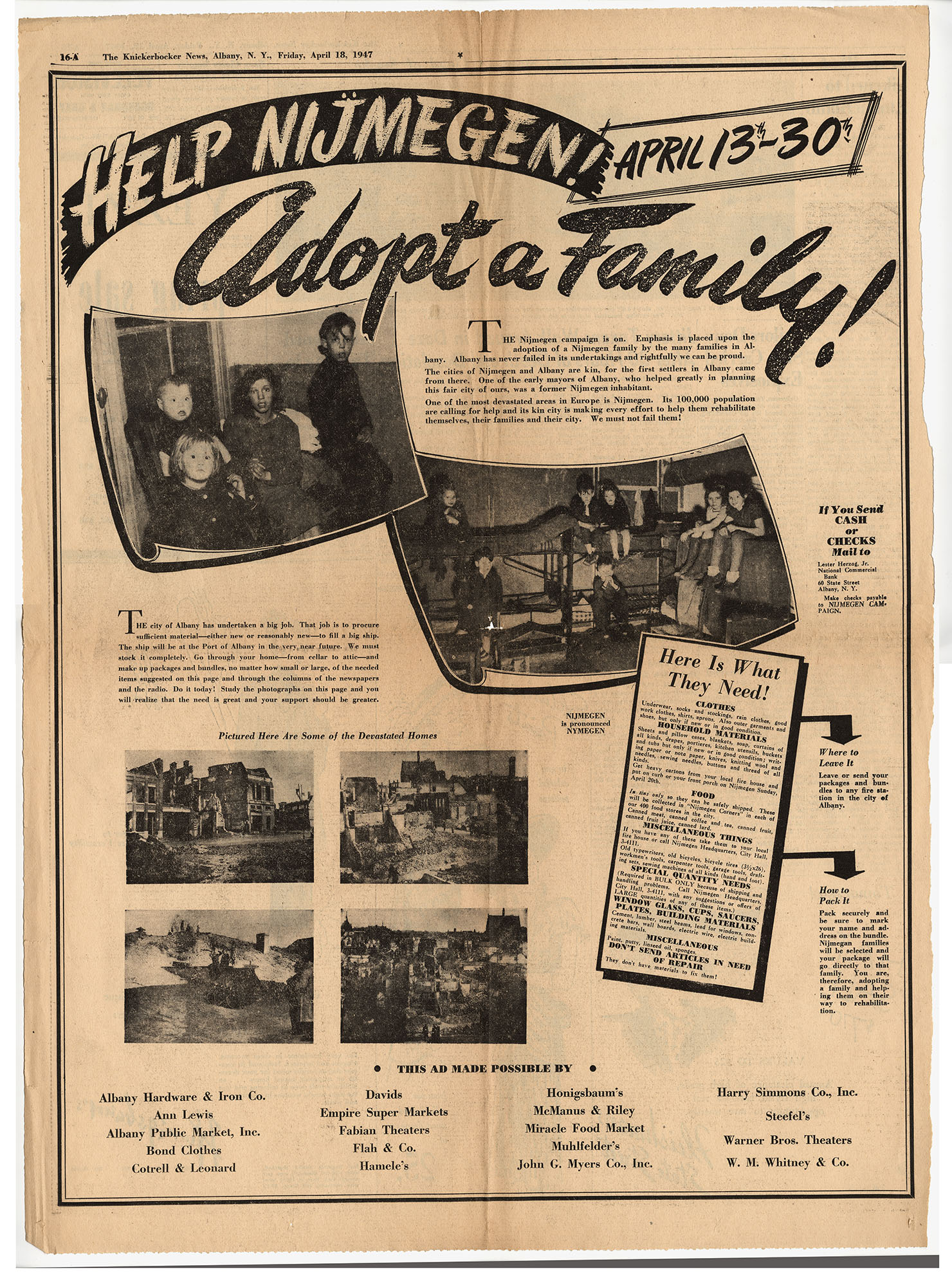 IMAGE: Help Nijmegen! April 13th-30th Adopt a Family! Times Union, Albany NY, Friday, April 18, 1947, Albany Institute of History & Art Library, MG238/F3, DI 1123