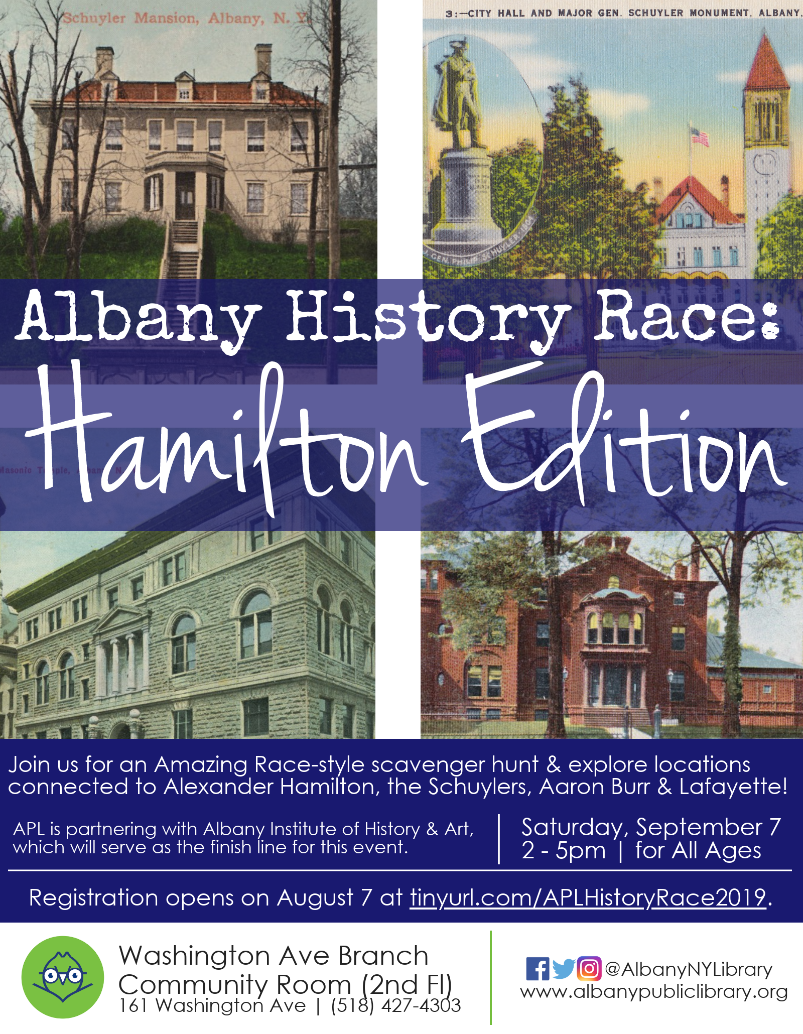 Join the Albany Public Library for an Amazing Race-style scavenger hunt to discover Albany's connections to Alexander Hamilton, the Schuyler family, Lafayette, and Aaron Burr! This year, the Albany Institute of History & Art is excited to serve as the finish line.