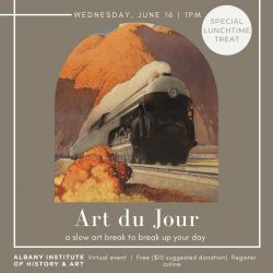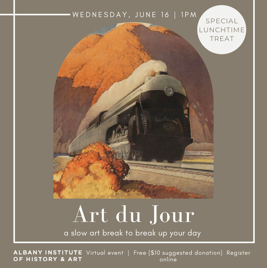 Take a break! This virtual program features a relaxed, explorative discussion of the painting The New Empire State Express by Leslie Ragan. Participants will be guided through a contemplative analysis of the painting by a member of the education staff. The guided discussion will be about 30-45 minutes, perfect for a break from your busy day at work or at home. No background in art is required to enjoy this program, but reservations are required.
