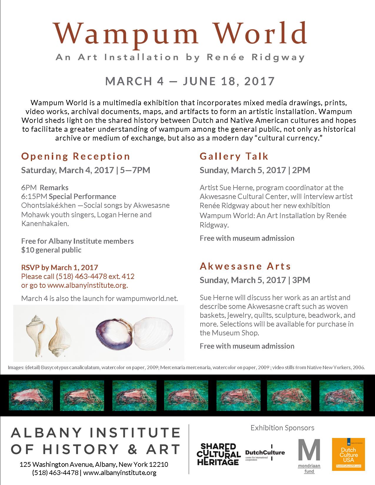 This March, the contemporary art exhibition Wampum World: An Art Installation by Renée Ridgway opens at the Albany Institute of History & Art in Albany, New York. This multimedia exhibition is an artist’s interpretation of the changing meaning of wampum from culture to culture and time period to time period. It combines video installations and the artist’s watercolors and collage works with objects that the artist has selected from the museum’s collection of Dutch colonial materials. No physical wampum is exhibited in this exhibition.