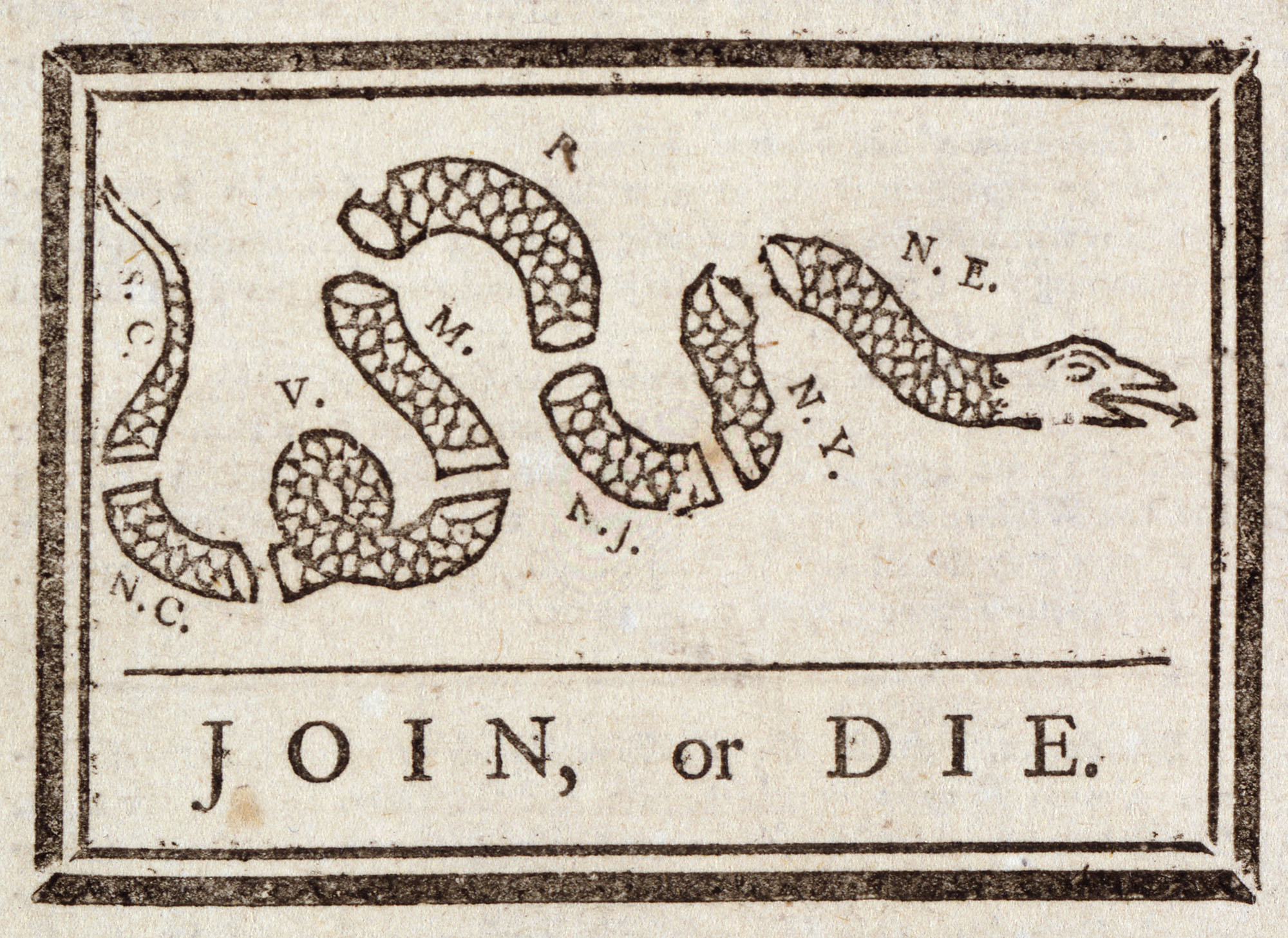 Prior to the meeting at Albany, Benjamin Franklin published a cartoon in the May 9, 1754, issue of his newspaper, The Pennsylvania Gazette, that showed a dissected snake with each part identified as one of the British colonies. The cartoon visualized the importance of unity as they confronted the French over control of the North America.