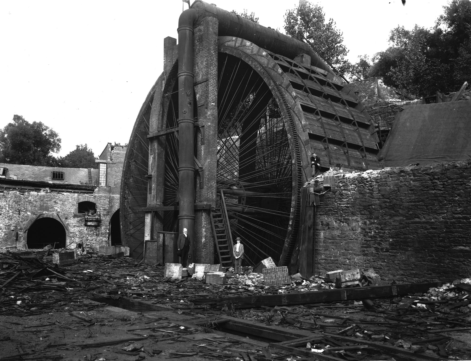 In addition to horseshoes, the iron works was also known for its giant water wheel. In 1851, Burden designed and built a water wheel that was sixty-two feet in diameter and twenty-two feet wide. The wheel was supplied by the Wynantskill Creek and generated 500 horsepower. Local residents frequently stopped to have their photograph taken with the “Niagara of Water Wheels.” It was left upright and intact after the dismantling of the water-powered plant in 1899 as a memorial to Burden’s ingenuity, and remained standing until 1914, when it collapsed onto its side. It was blown up for scrap value in 1932.