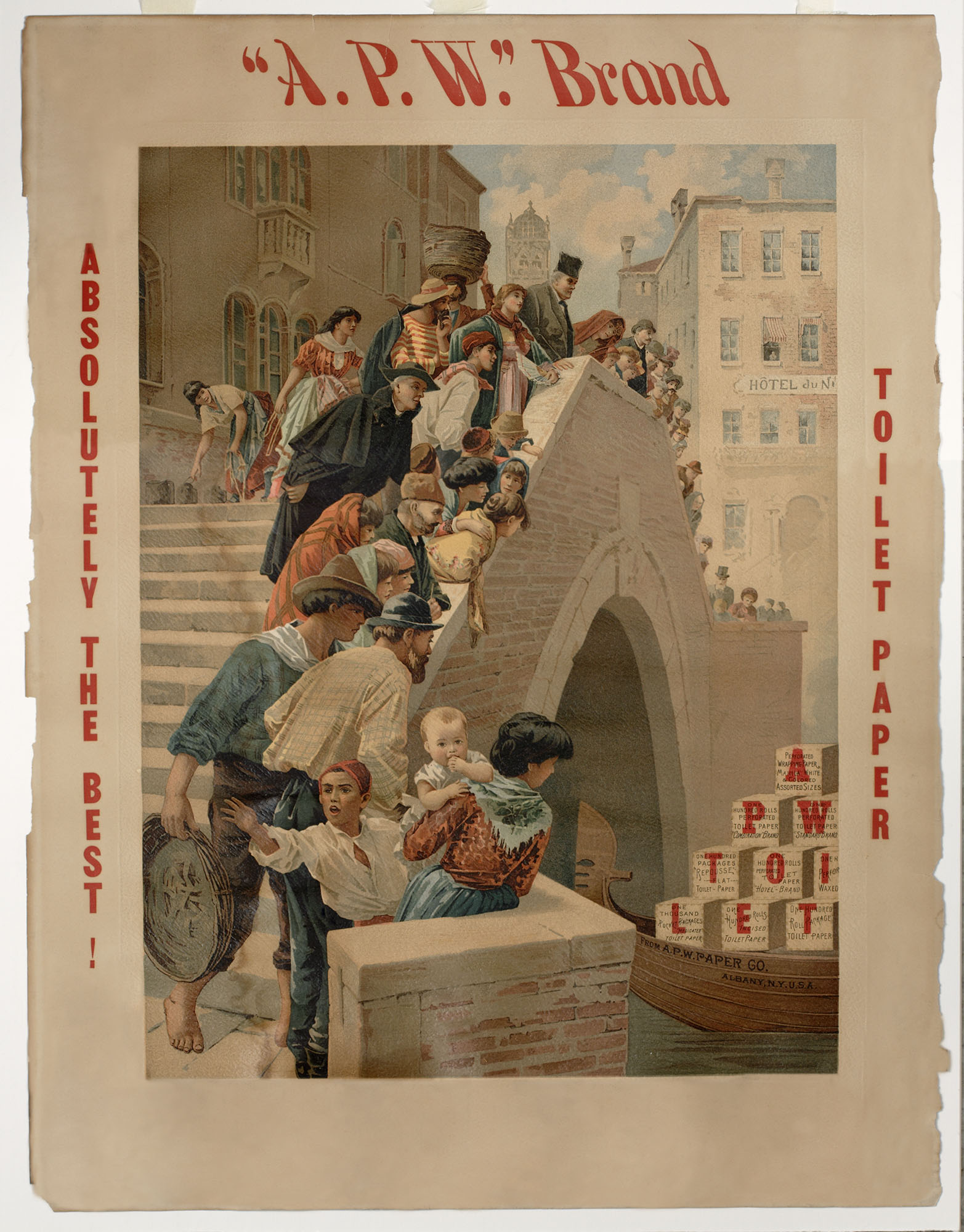 On July 25, 1871, the United States Patent Office issued Albany businessman and inventor Seth Wheeler a patent for his improvement in wrapping papers. His simple but novel idea consisted of a “roll of wrapping-paper with perforations on the line of the division between one sheet and the next, so as to be easily torn apart.” The invention revolutionized not only the appearance and dissemination of wrapping paper, but also toilet paper, which became the most important product of Wheeler’s company, the Albany Perforated Wrapping Paper Company (later known as APW), incorporated in 1877. Before the development of perforated rolled papers, manufacturers manually cut their paper into sheets, bundled and wrapped them in more paper, and tied the bundles with string.