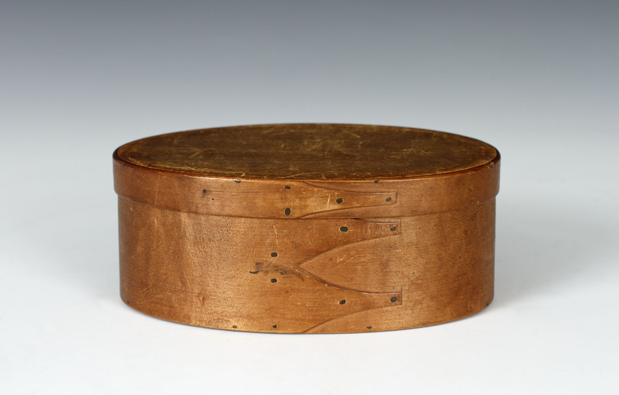 The Shakers of several communities made the iconic oval wood box and sold them to visitors and merchants from outside the community. This box, probably made at the Mount Lebenon, New York, community, includes the pencil inscription “William P. Van Rensselaer/Manor House/Albany N.Y./September 2nd, 1825.” William may have acquired the box from a peddler or from a local merchant.