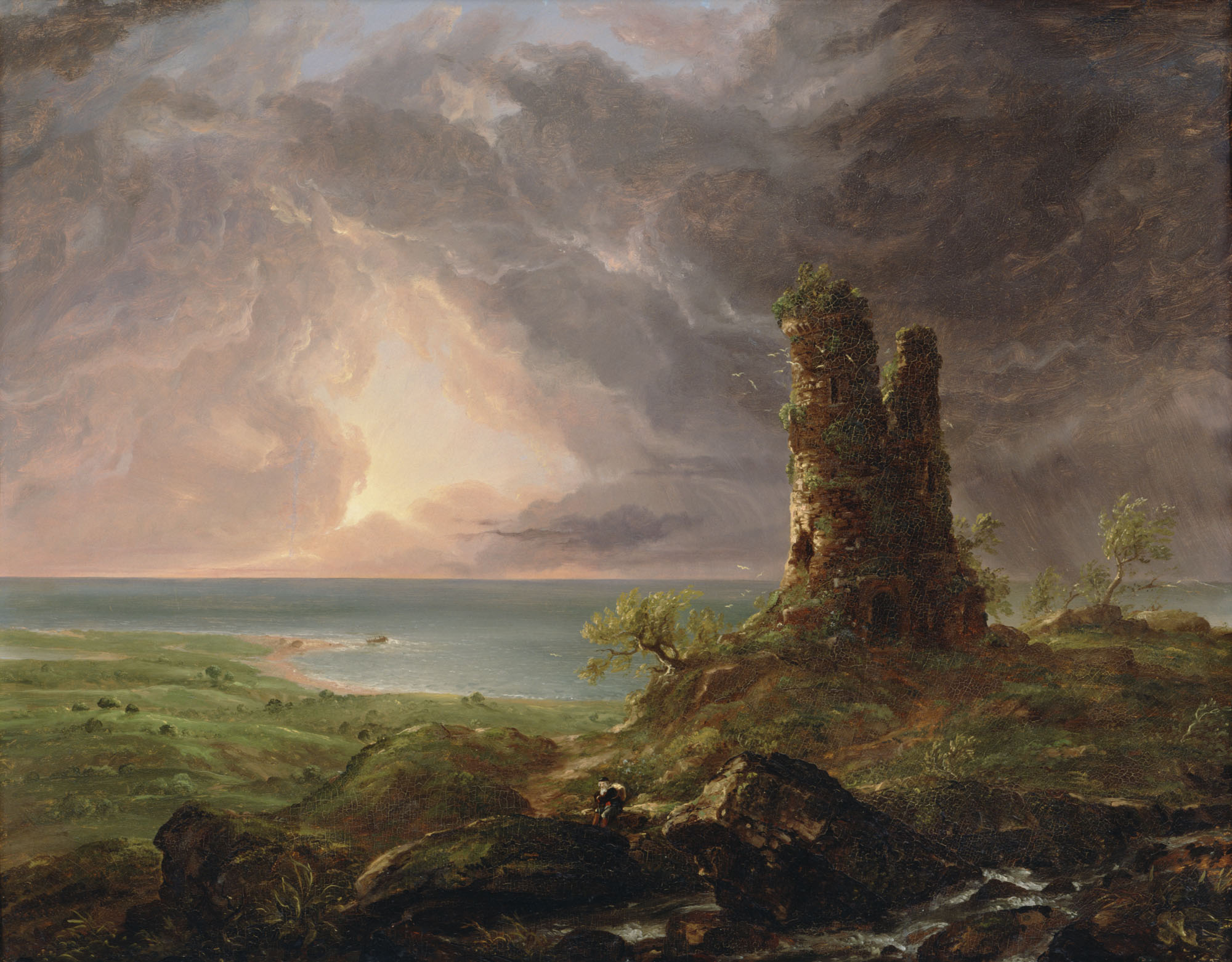 Thomas Cole’s painting of a ruined tower originated from his travels in Europe between 1829 and 1832. Soon after his arrival in England, Cole met with the highly regarded British landscape artist John Constable, who exhibited his painting, Hadleigh Castle. The Mouth of the ThamesMorning after a Stormy Night (1829), at the June exhibition of the Royal Academy. Cole’s painting practically mirrors Constable’s work. In addition to seeing ruins captured in paint, Cole viewed several actual ruins, both classical and medieval, during his travels to Italy in 1831 and 1832.