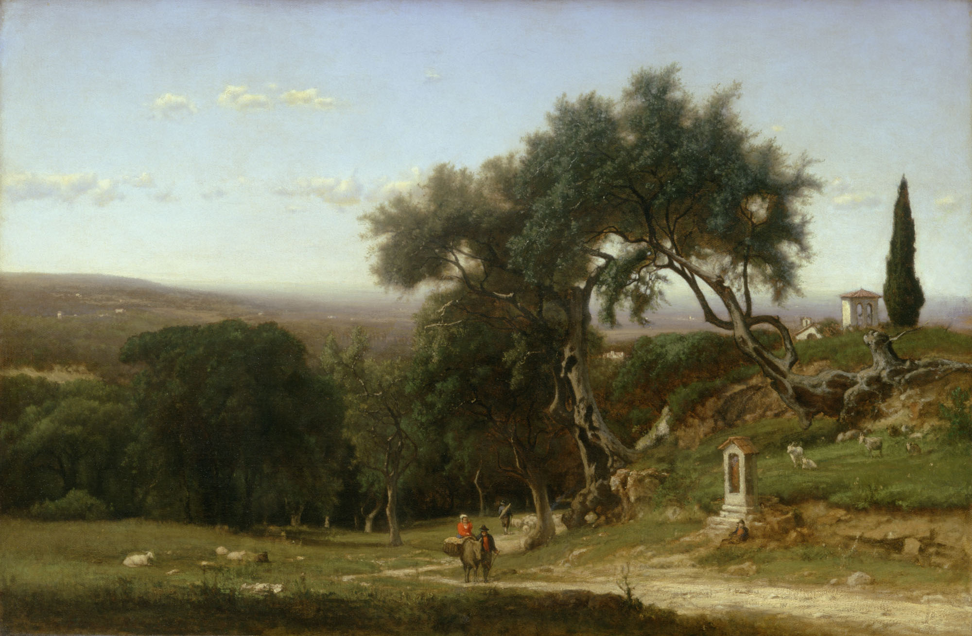 In April 1870, George Inness traveled to Rome, Italy, where he remained for the next four years. It was his third trip to Europe, and this one was his most productive. Before leaving, he made arrangements with the Boston art dealers Williams and Everett to sell his paintings in exchange for regular monthly payments. The agreement funded Inness’s stay in Rome, but it also pressured him to paint landscapes that appealed to a broad commercial market. To make certain his paintings were salable, Inness paid close attention to detail and finish. As he said, “finish is what the picture-dealers cry for.” The painting did find a ready buyer in the Boston collector Thomas Wigglesworth, who lent it to the Boston Art Club for exhibition in 1873.