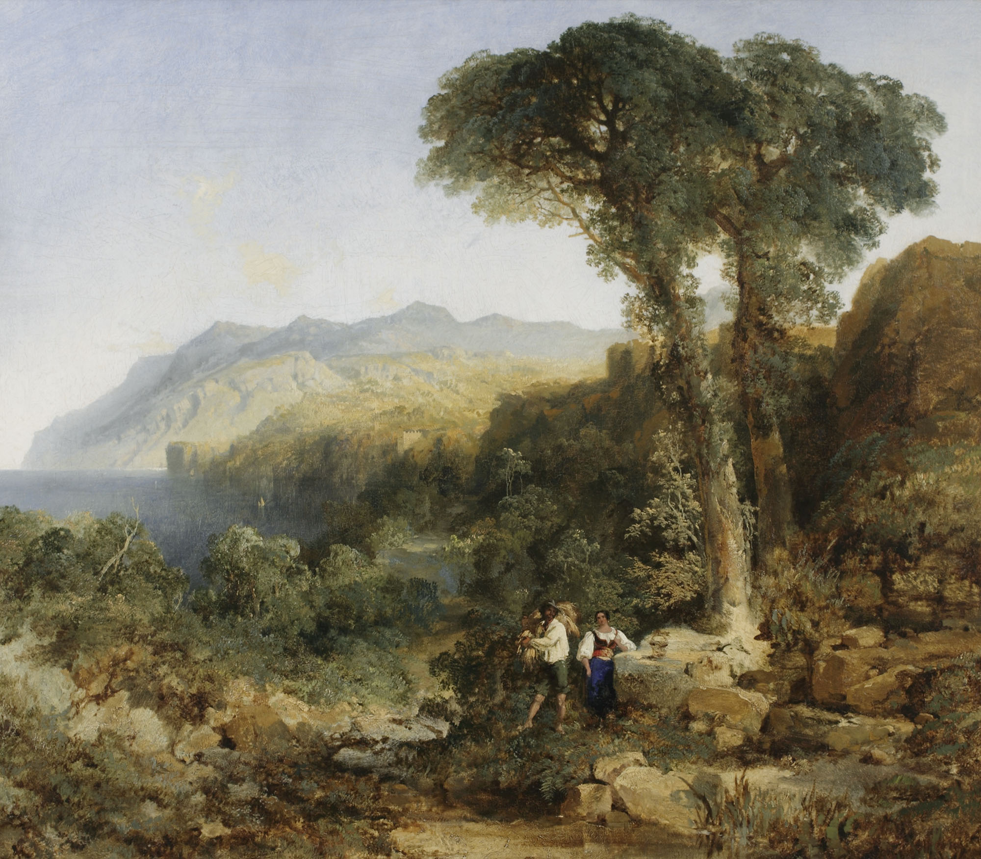 The abbey of Vallombrosa stands about nineteen miles southeast of Florence, Italy, on a wooded hill covered with beech and fir trees. During his first excursion to Europe Cole established a studio in Florence between May 1831 and October 1832. It was most likely during that time that he painted this small oil sketch of the abbey. Vallombrosa was a popular spot with tourists because of its picturesque beauty and its associations with the seventeenth-century English poet John Milton, who based his description of Paradise on the abbey: “In Vallombrosa, where th’Etrurian shades high over-arch’d embow’r.”