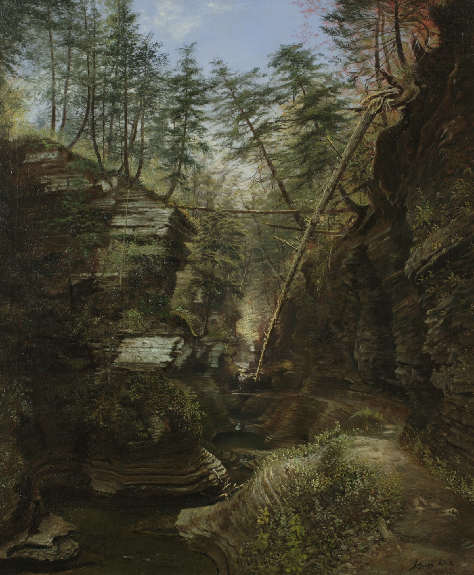 The eroded limestone walls that form Watkins Glen in the Finger Lakes of central New York are captured in amazing detail in this painting by James Hope. One can easily see in the layers and striations the transformative effects caused by thousands of years of running water. Yet Hope’s painting is not merely about geology and the processes of change; it is a visual embodiment of time itself, a tangible sign that allows its viewers to see something intangible.