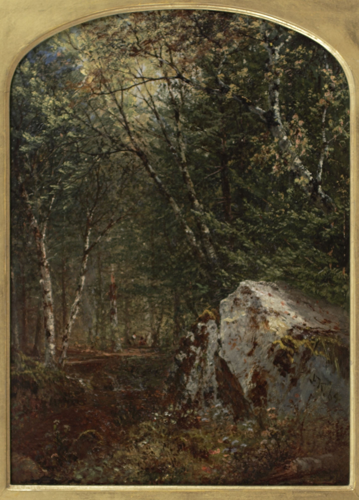 John Frederick Kensett frequently painted rock formations with amazing attention to detail. Here, in this narrow woodland scene, the light-colored boulder in the foreground attracts the viewer’s notice and draws the eye toward the rock’s crevices and moss-covered surface. The boulder is Kensett’s primary subject, the star of his production. He even focused a beam of light directly on the boulder, like a spotlight on a stage performer, and the trees and bushes that surround it form the backdrop.