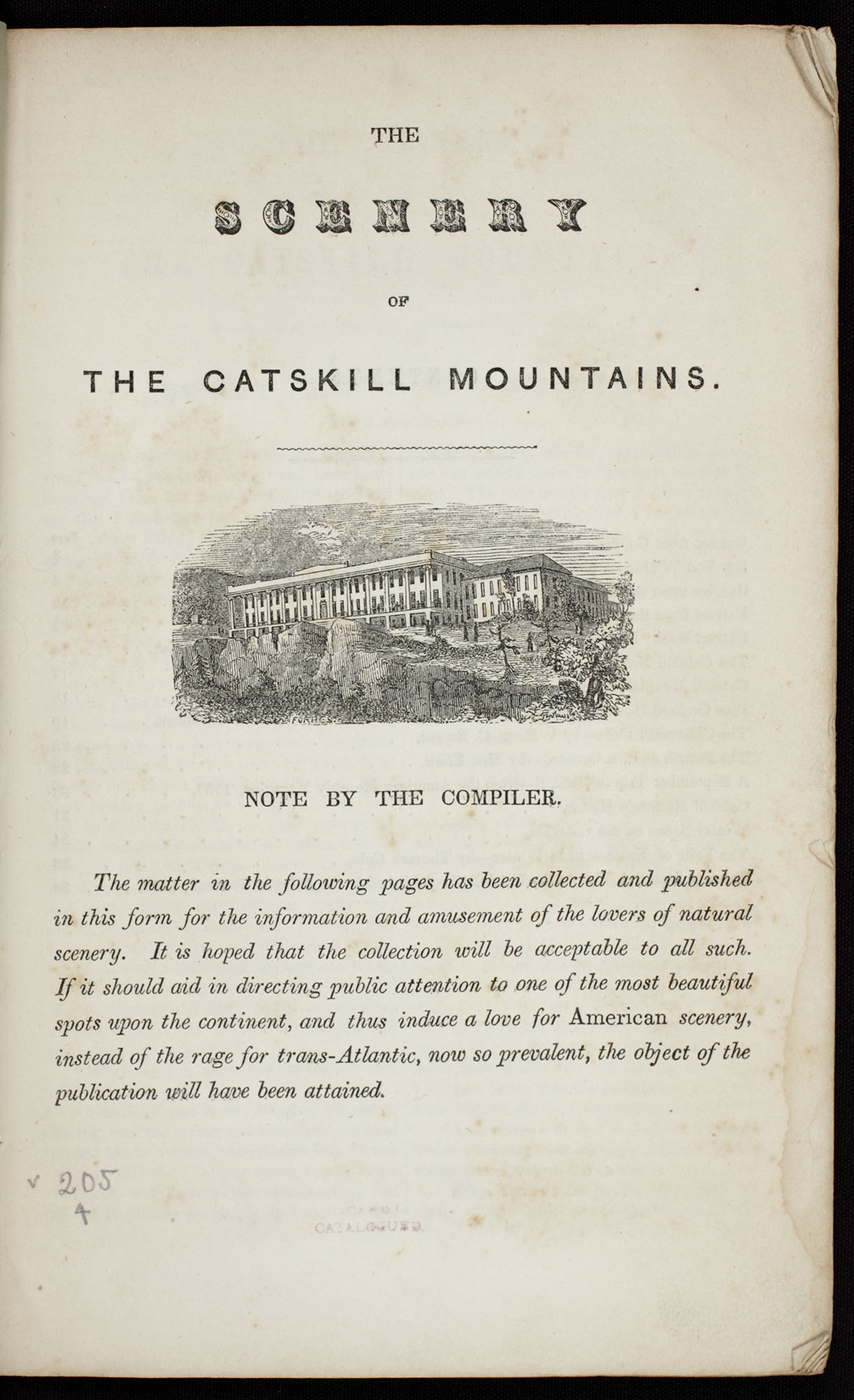 Charles L. Beach, the owner of the Catskill Mountain House commissioned the Reverend David Murdoch to compile this booklet of poems and written descriptions of the Catskill Mountains and the Mountain House. The booklet first appeared in 1846 and was reprinted several times into 1870s.
