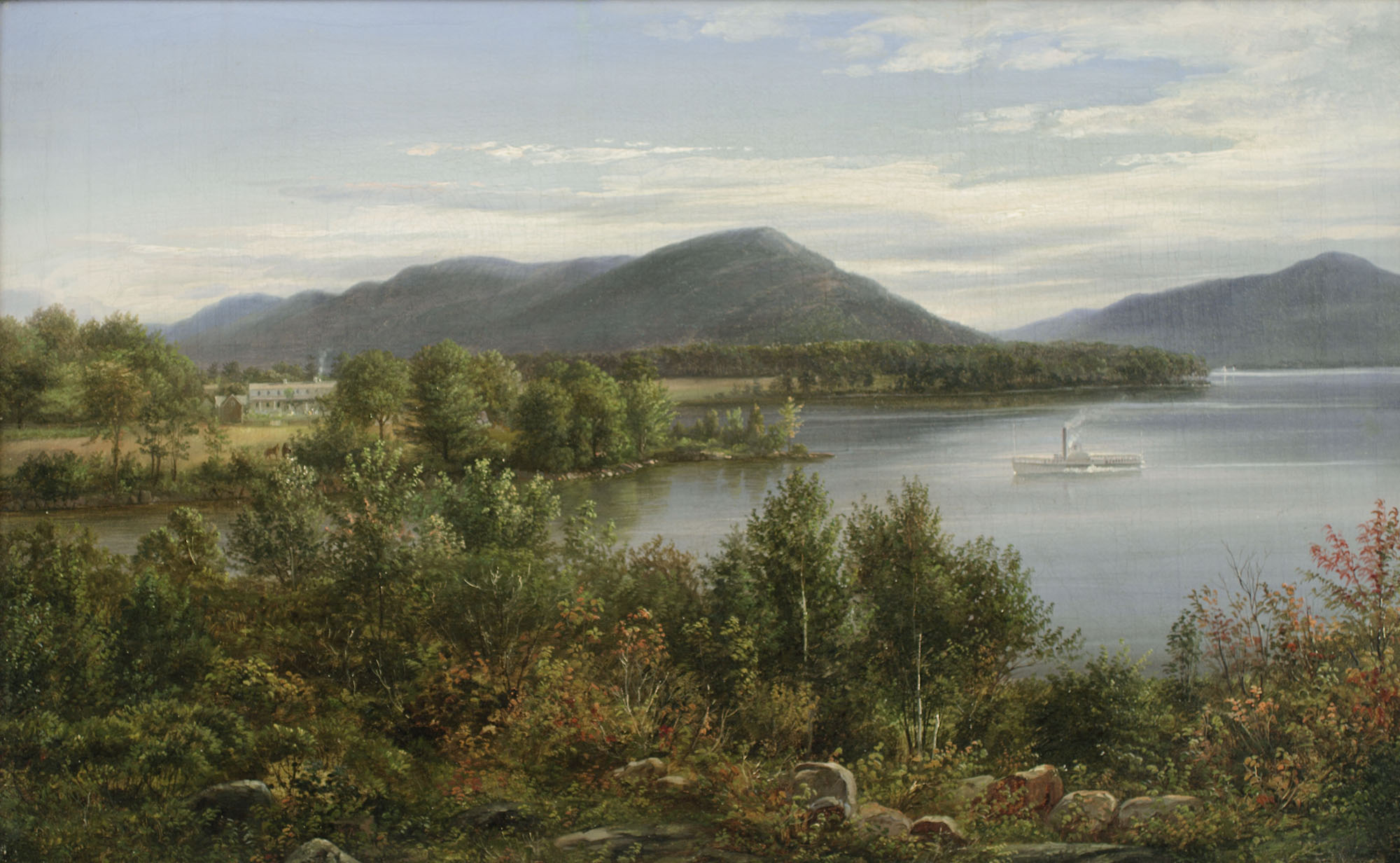 The travel writer Mrs. S. S. Colt said of Lake George in her book The Tourist’s Guide through the Empire State (1871), “its tranquility is something like the morning after a ball. There is nothing but to croquet or sit on the piazza, or go boating or fishing upon the lake . . . ‘Most of the visitors are guests of a day, but there are pleasant parties—poets and painters often—who pass weeks at the lake or at one of the private houses near.’” A few years earlier, the artist Alfred Thompson Bricher was one such painter in a pleasant party.