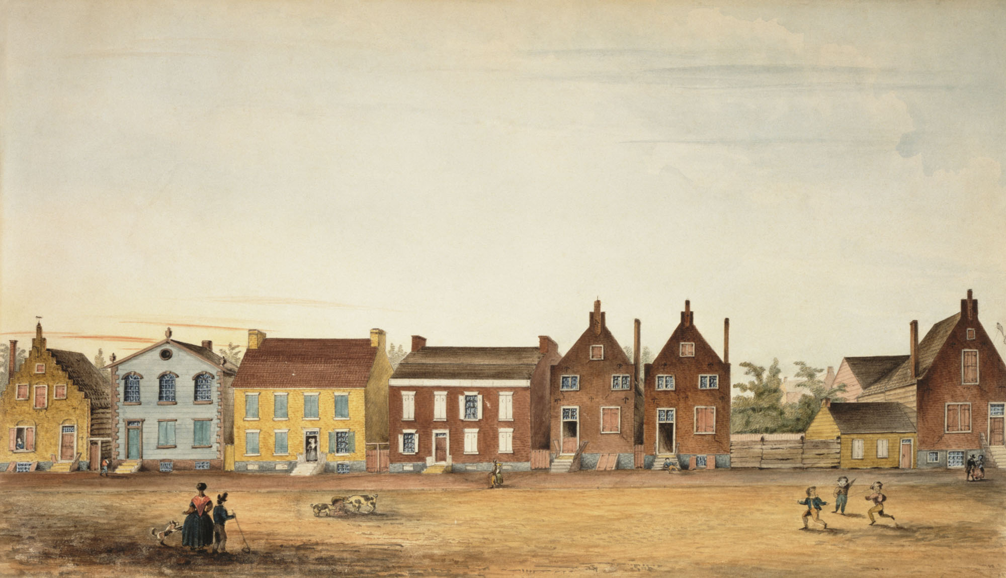 James Eight's watercolors take viewers on a romantic journey through a city of Albany filled with quaint Dutch influences. Since the 1850s, they have been used to reinforce a romantic view of Albany's past. This image was created from a combination of memory, research, and observation. It provides insights into the character of Albany as it expanded into a commercial transportation center. It shows North Pearl Street, where a black woman and child stand in the foreground as reminders of the vital part of African-Americans played in Albany's economy and society.