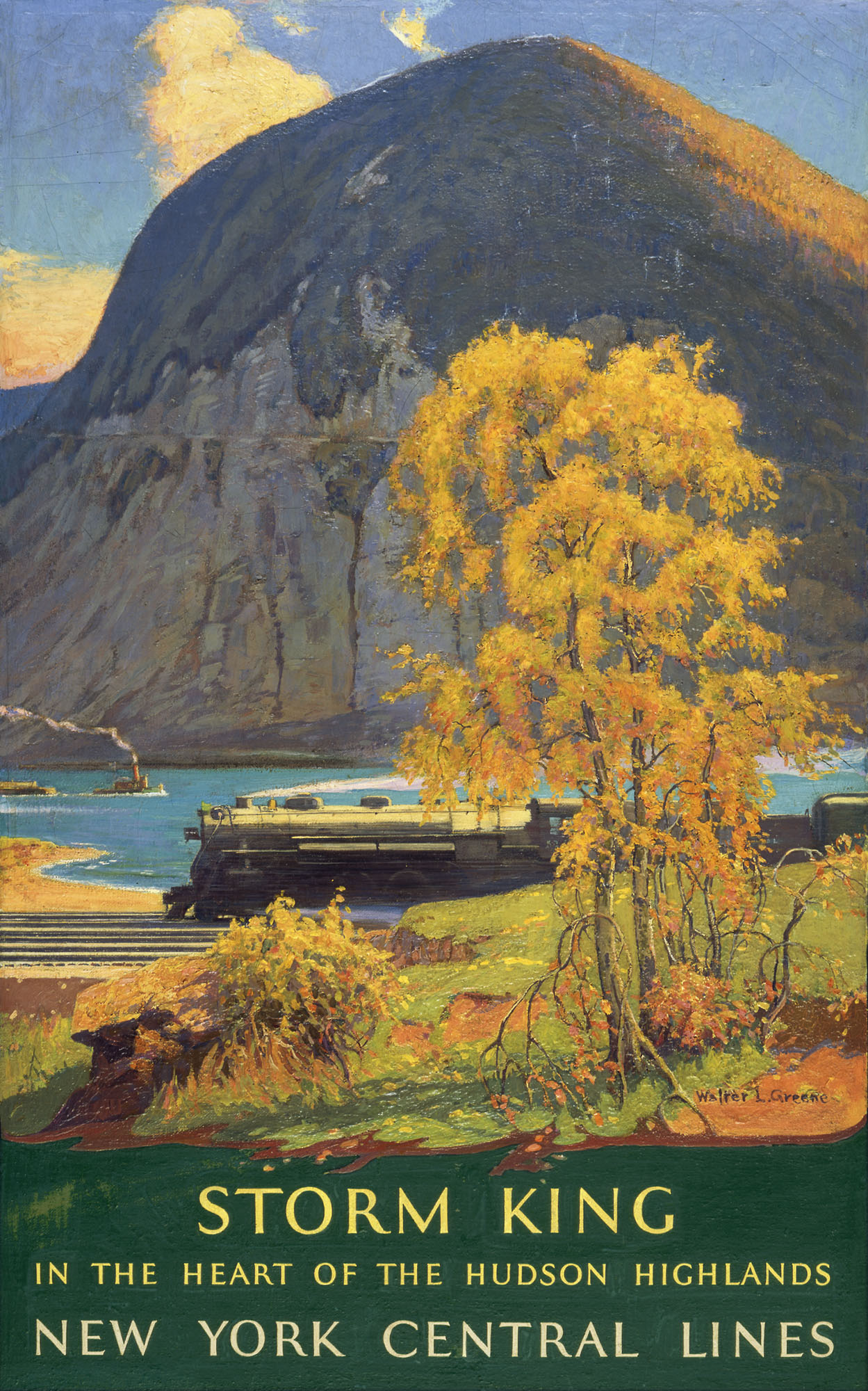 The Schenectady, NY, artist Walter L. Greene produced rich, attractive landscapes of the Hudson Valley and Adirondack Mountains for the New York Central Lines. The original painting of Storm King in the Heart of the Hudson Highlands was reproduced as posters through offset photolithography.