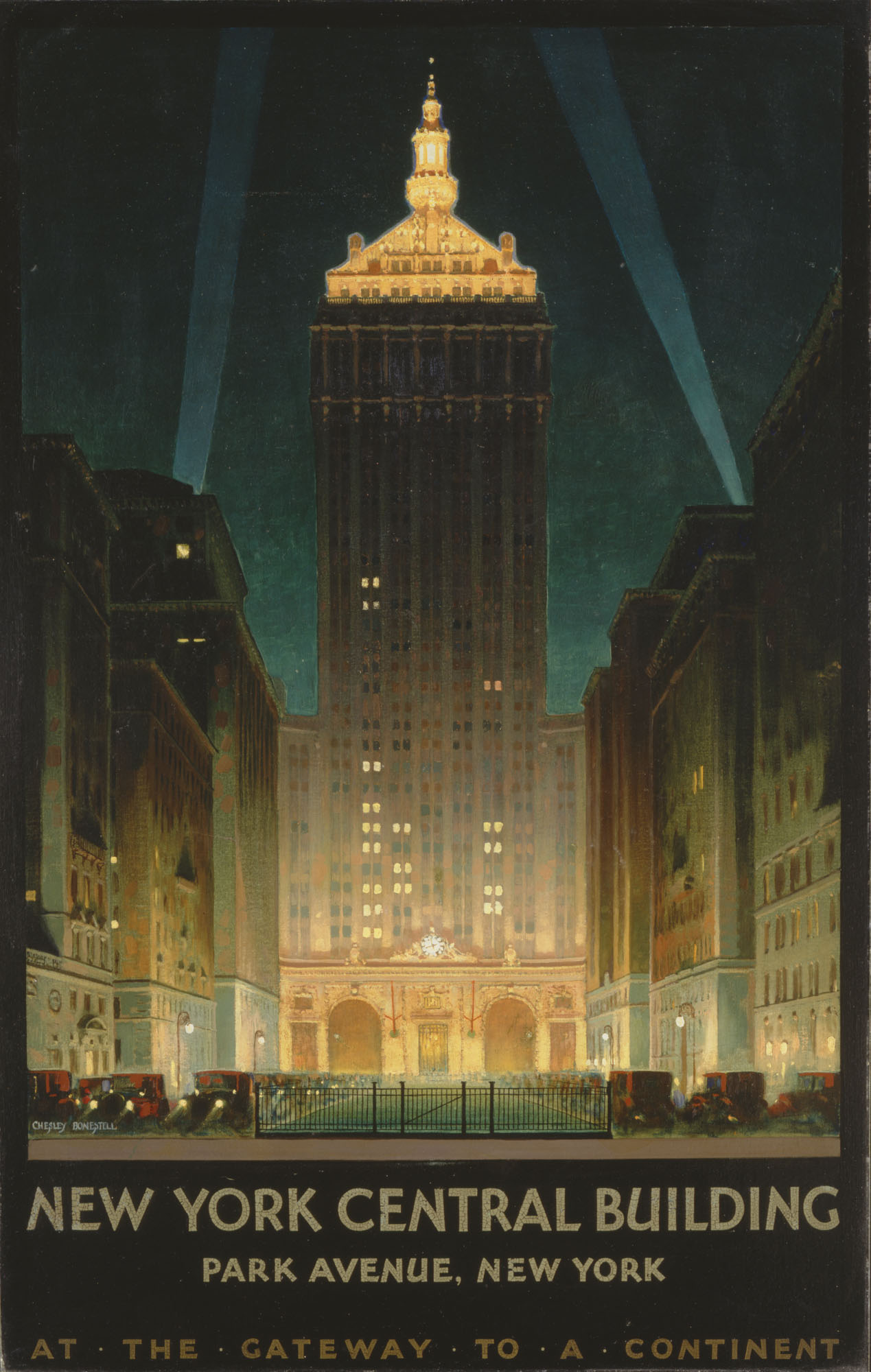 As railroads consolidated in the mid nineteenth century, the New York Central Railroad emerged as one of the premier rail lines servicing the Hudson River Valley. This oil on poster board painting by Chesley Bonestell depicts an illuminated nighttime view of the New York Central Building on Park Avenue in New York City. Floyd Yewell's urban nightime painting Central Terminal Buffalo-New York is also in the collection of the Albany Institute's collection of New York Central paintings, posters, documents, ephemera and artifacts.