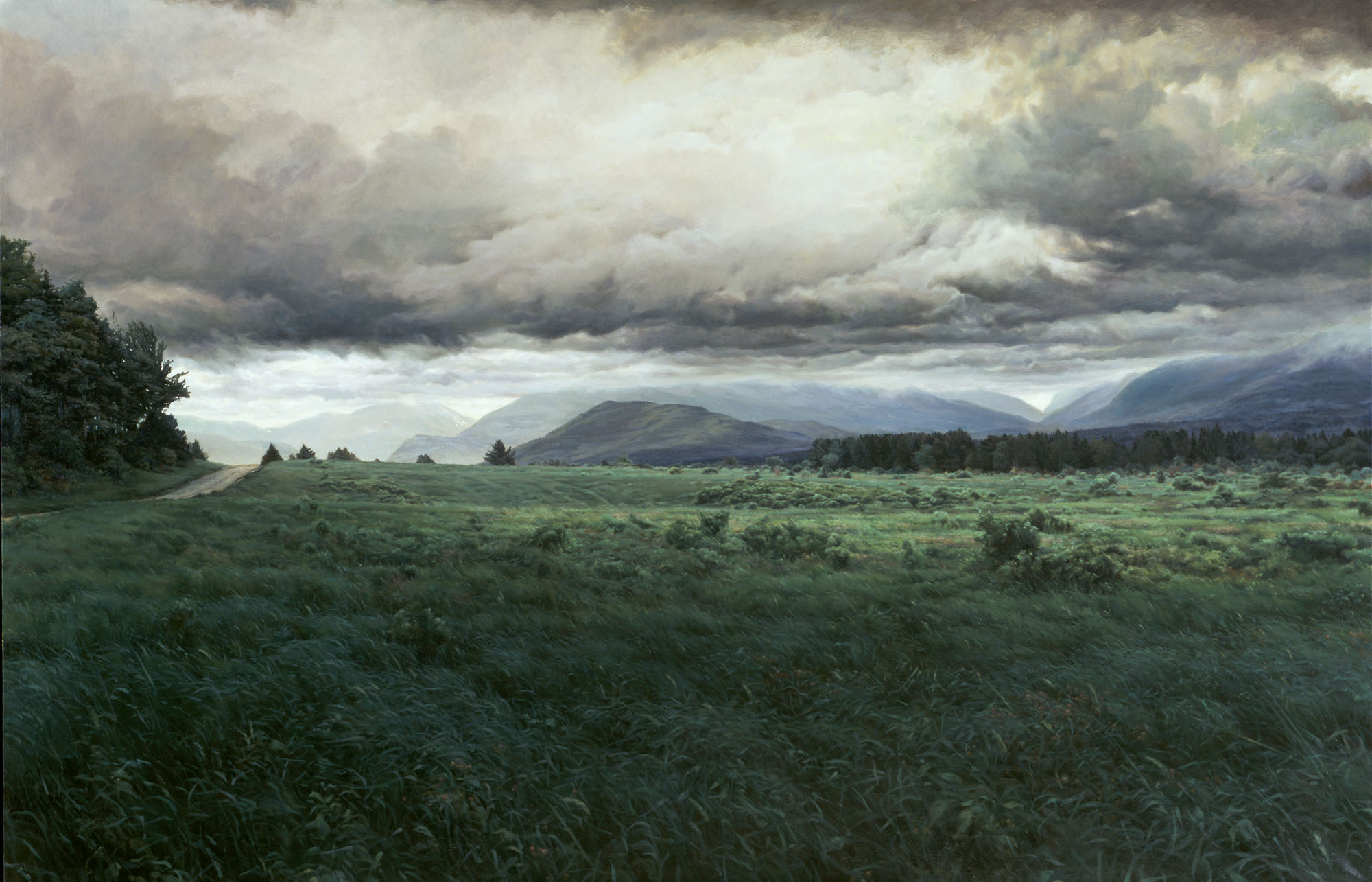 North Elba was David Coughtry's first large-scale oil painting. It shows a view looking toward the high peaks of the Adirondacks across a meadow known as the Plains of Abraham. In their somber mood of solitude and reverence, Coughtry's landscapes are reminiscent of the romantic realism of earlier Hudson River School painters. The painting was the Albany Institute Purchase Prize for the 1984 Exhibition of the Artists of the Mohawk-Hudson Region.