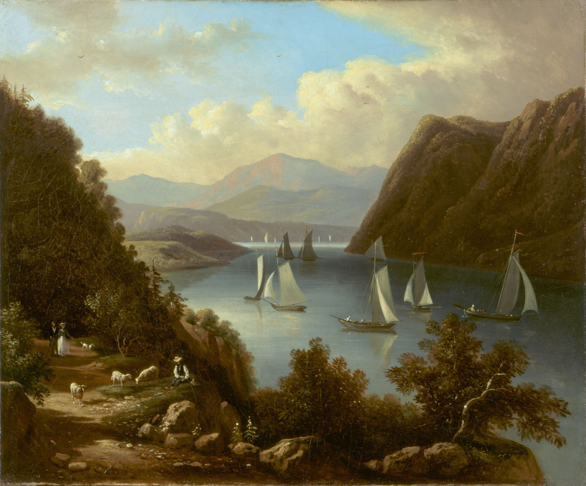 Entrance to the Highlands on the Hudson was painted in France, c.1845, by French salon artist Hippolyte-Louis Garnier and is based on a nineteeth-century Hudson River view by Jacques-Gerard Milbert in his publication Itineraire Pittoresque du Fleuve Hudson.